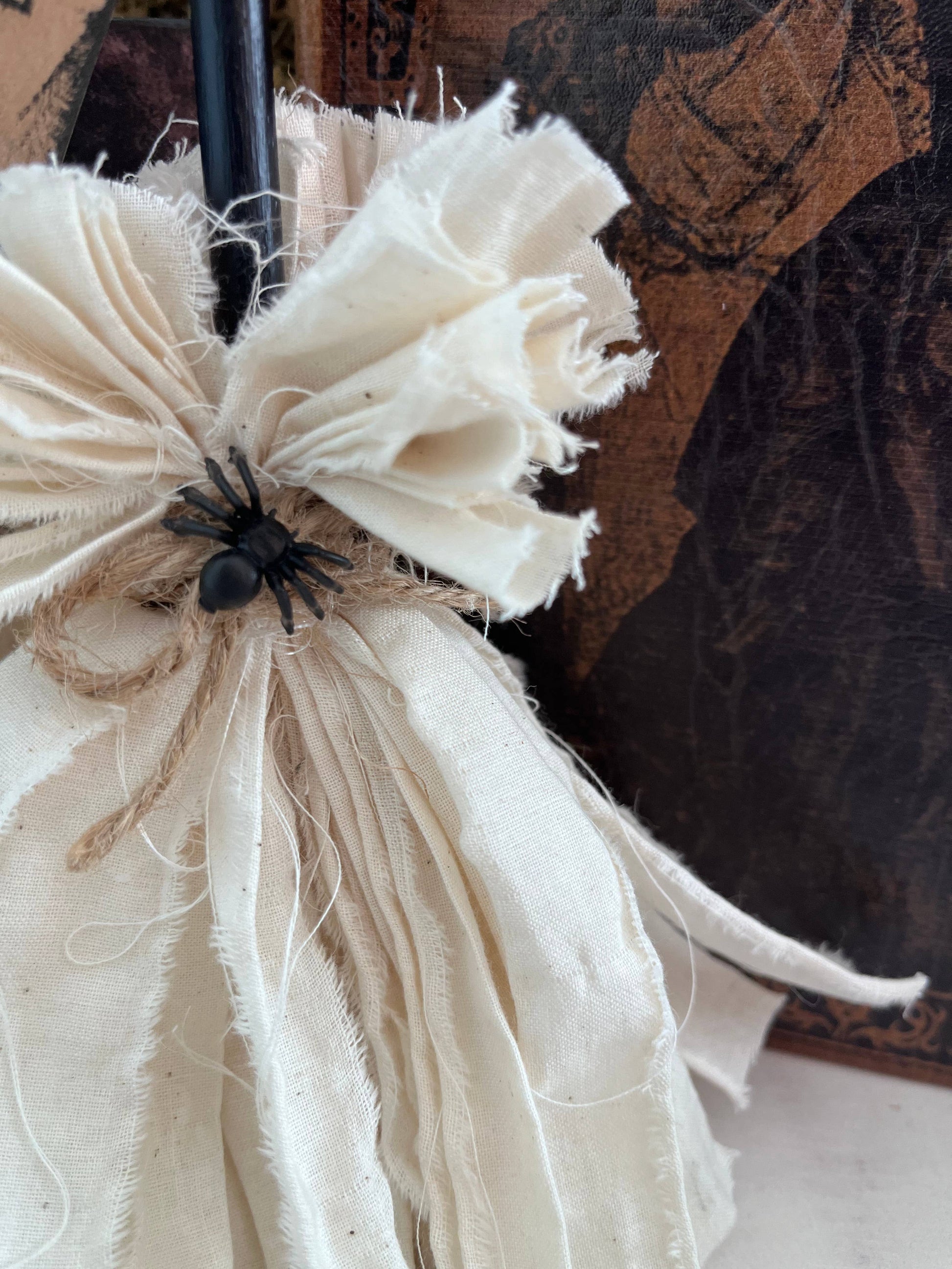 Our rustic primitive witch broom is a fun touch to your Halloween decorating. Has a small base so it can stand independently, or easily layered with other items. Each tag is hand stamped and so each will look unique.