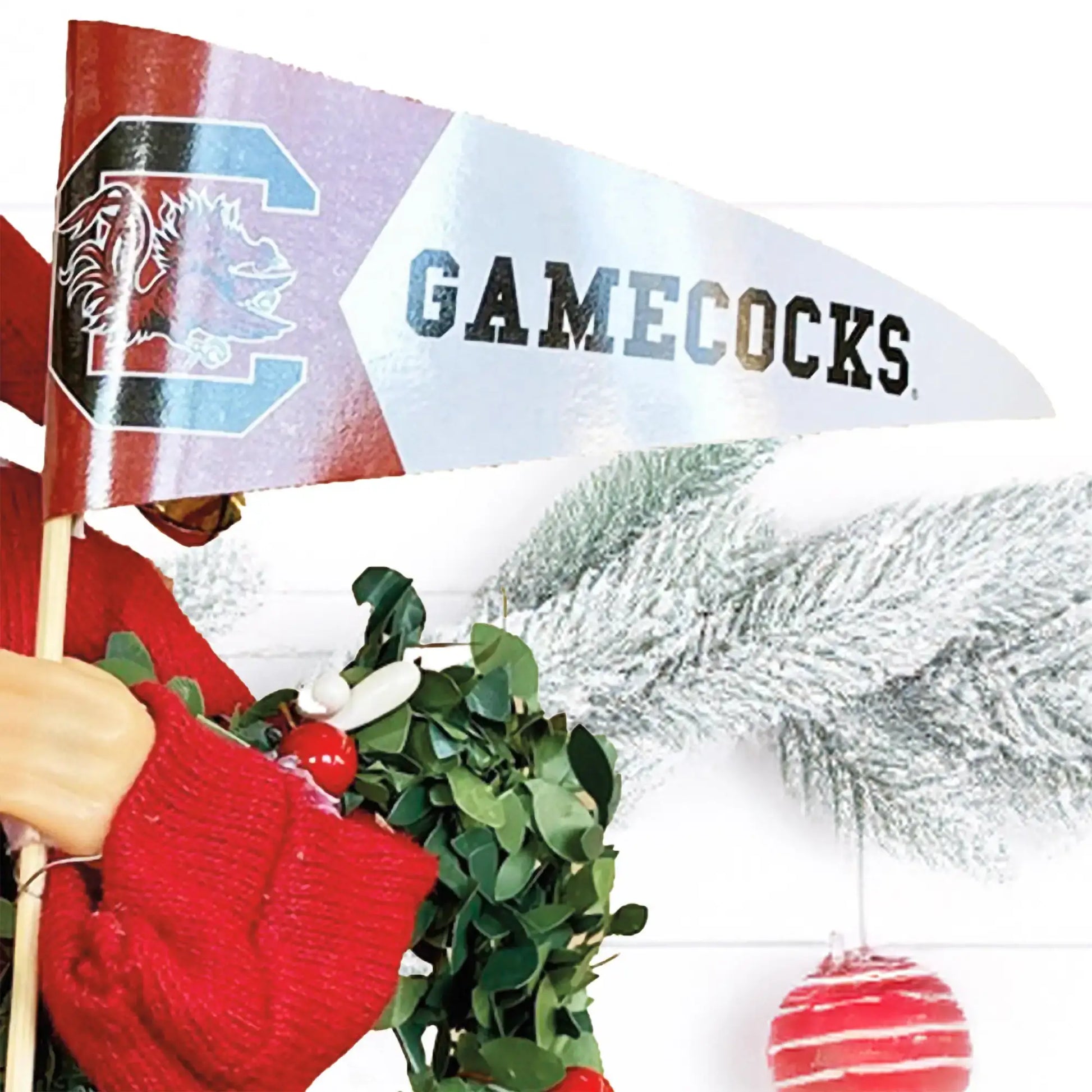 Has your team been good this year? Really good? Well, even if your favorite team didn't take the championship, Santa will make sure you have a perfect season! Wearing his favorite logoed sweater and toting a Christmas list, wreath, school pennant and big sack of goodies, Santa is ready to round up his reindeer and head to your town. Make the holiday season one to remember with this wonderfully handcrafted 12" South Carolina Proud Santa.