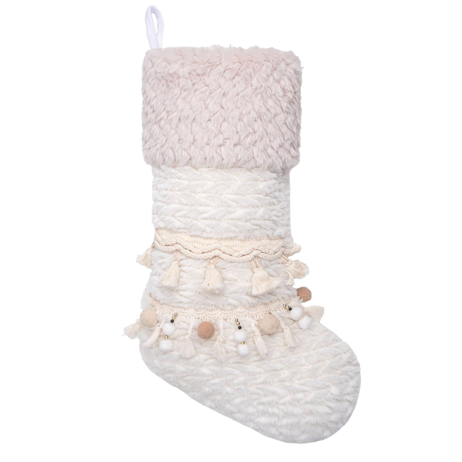 Enhance your holiday decor with these Bohemian-style Christmas stockings, available in a set of six. Crafted with woven rope tassels and fringes, and primarily in white and beige colors, these stockings offer a unique and elegant look.