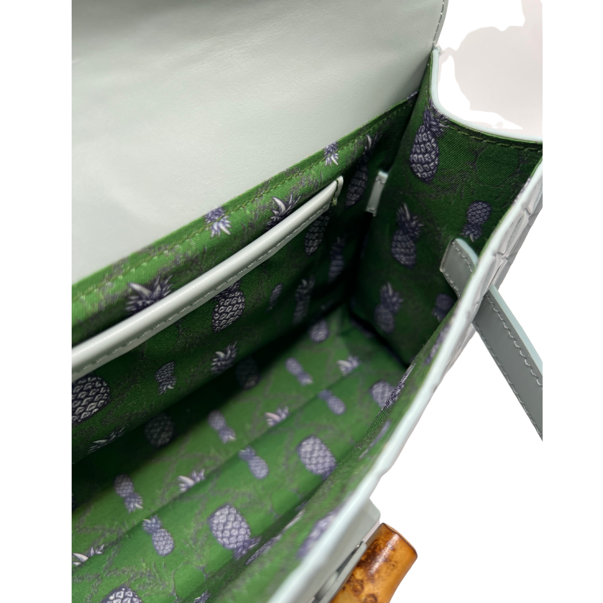 Vegan woven leather with bamboo hardware. Green Pineapple Print interior lining.