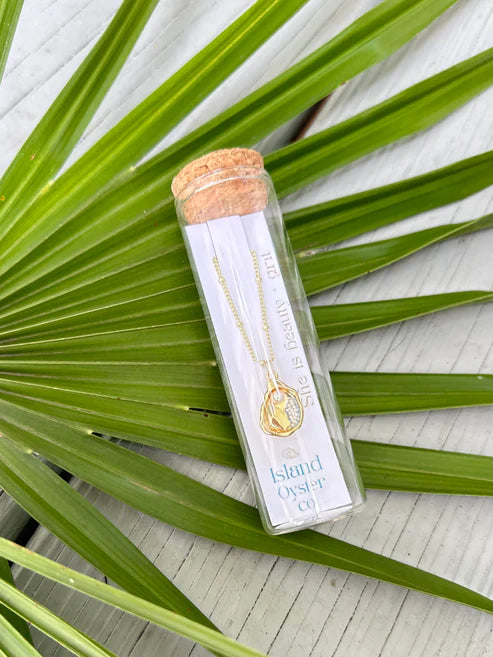 Nestled inside a 3-inch glass vial with a cork top — like a treasure washed ashore — this necklace makes the perfect gift or keepsake. It features a dainty 18”inch gold satellite chain, subtly detailed with tiny gold accents for added texture and shimmer. Hanging from it is a small gold oyster pendant, cradling a tiny pearl within — a quiet reminder that beauty is often found within life’s grit.