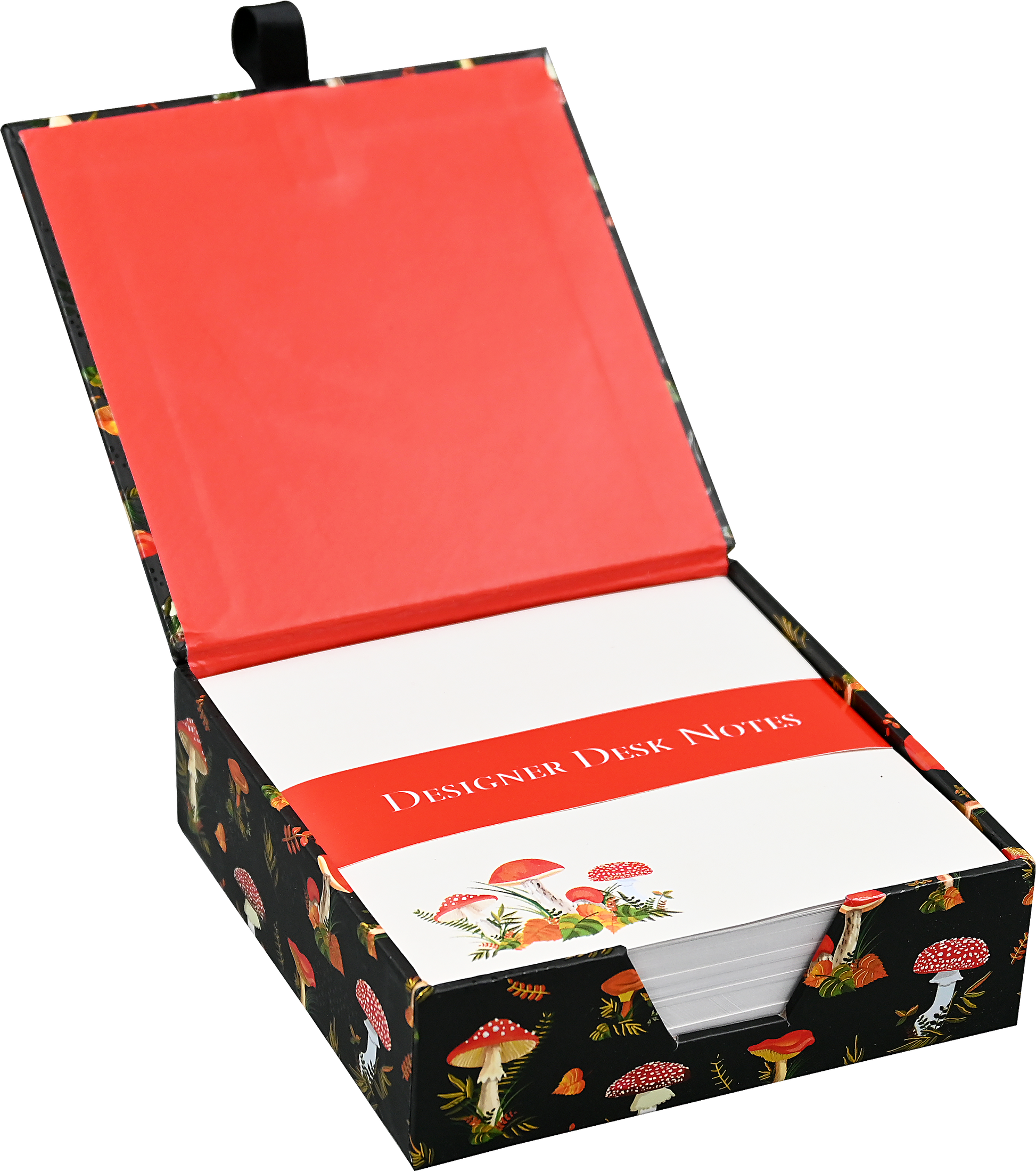 Capture thoughts, reminders, and spontaneous ideas in style on these delightful memo sheets. Our keepsake box ensures they're always within reach! Desk Notes set contains 250 note sheets within a keepsake box featuring a charming woodland design, with vibrant mushrooms, leaves, and ferns against a black background.