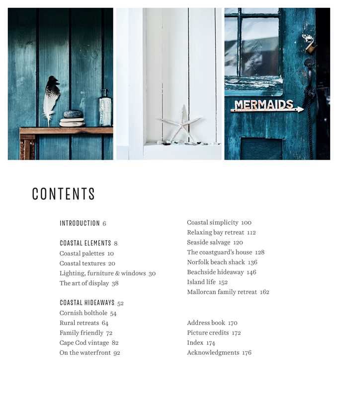 The first part of the book offers up Sally’s unique take on coastal style, celebrating the colours and textures of the seaside: bare wooden boards, uncurtained windows, and furnishings covered in robust linen or cotton that will endure salt water and the sun’s rays. Sally also looks at lighting, furniture, and coastal decorative accents such as maps, charts, and nautical-themed accessories. She draws inspiration from beachcombing, displaying shells and driftwood to feel close to nature and the sound of the waves.