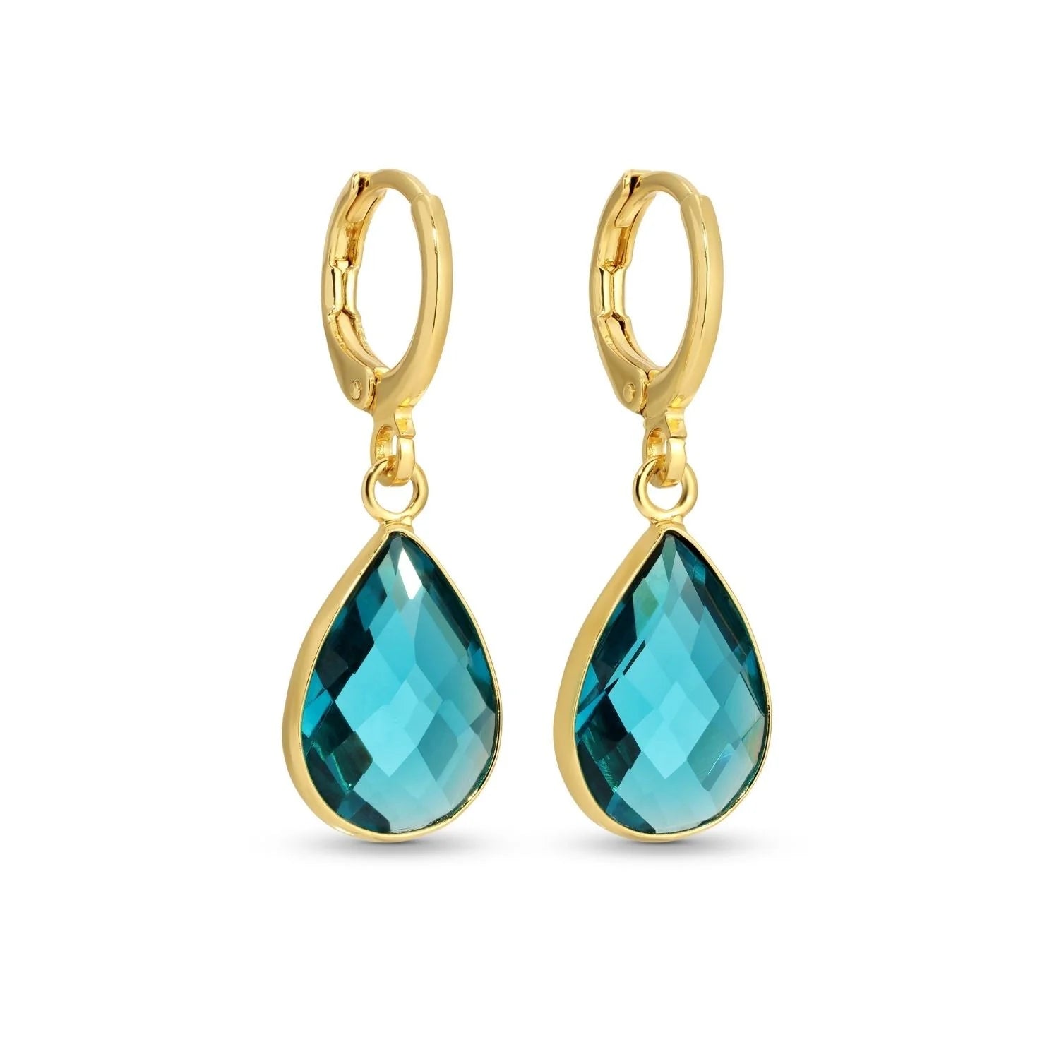 Our Teardrop Huggies are what crystal inspired dreams are made of! Crafted with a brass base, each huggie is then coated with 18K gold plating. The true highlight of these huggies is the stunning aqua teardrop crystal that dangles elegantly from each tiny hoop.
